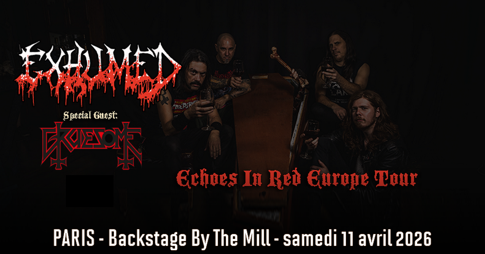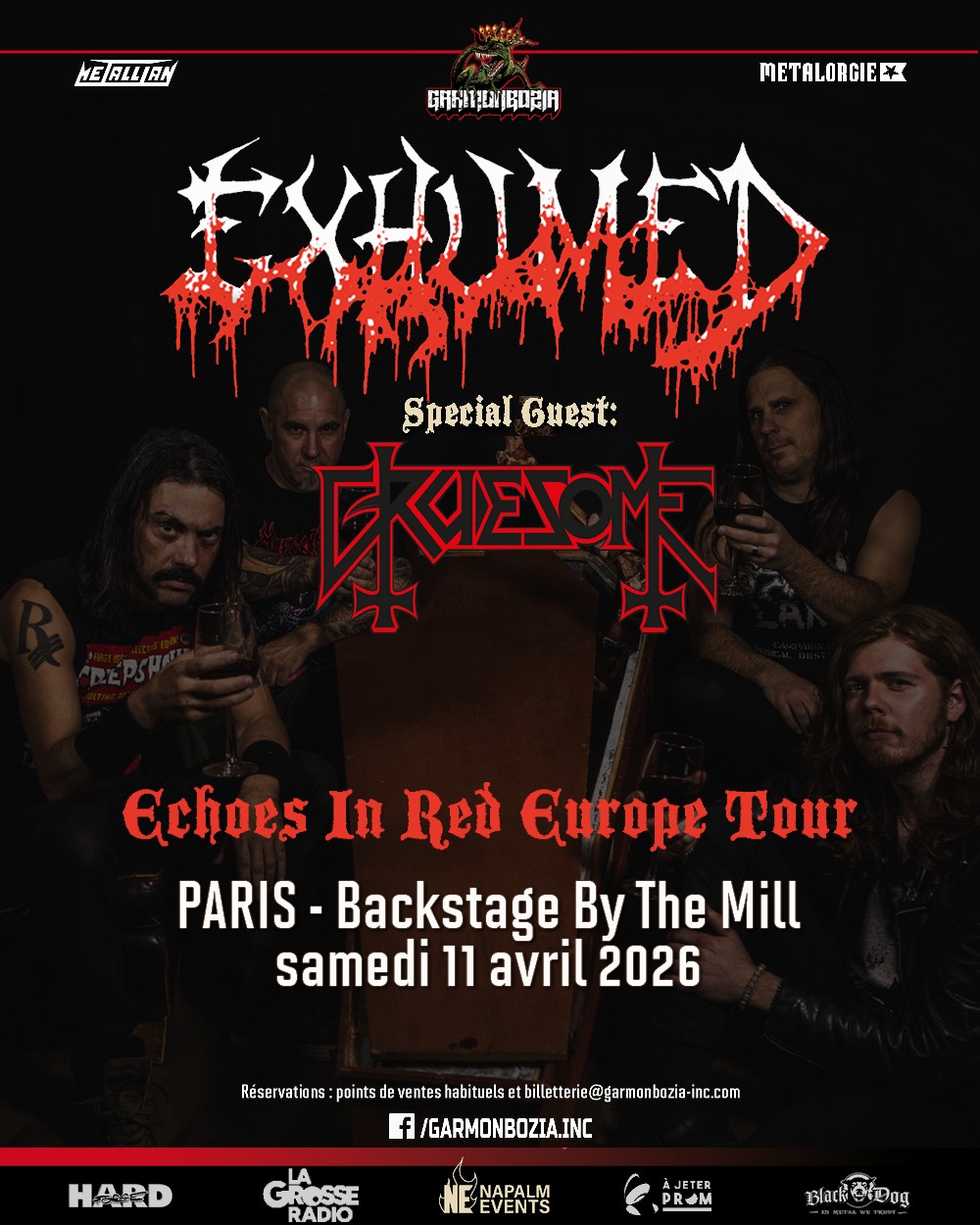 Pionniers du du « Gore » Metal revienent des profondeurs pour une tournée exceptionnelle où ils partageront le haut de l’affiche avec GRUESOME dont la musique est un hommage délibéré à la première vague de death metal de Tampa, en Floride, et plus particulièrement aux débuts de DEATH. La carrière légendaire d’EXHUMED n’a plus besoin d’être présentée, leur musique est l’aboutissement de plusieurs décennies de riffs cauchemardesques, de blast beats dévastateurs et de cris infernaux provenant des profondeurs mêmes d’où le groupe a émergé ! Voir EXHUMED en concert c’est accepter l’humble invitation du groupe de descendre six pieds sous terre pour les rejoindre pour découvrir ce qu’ils vous ont concocté. Vous n’aurez jamais pris autant de plaisir à être dégoûtés !GRUESOME revient en 2025 avec « Silent Echoes », un album célébrant plus d’une décennie en tant que meilleurs représentants du death metal old school inspiré par le légendaire Chuck Schuldiner et les nombreuses itérations de DEATH. Ce nouvel opus voit GRUESOME s’éloigner des riffs déjà entendus sur leurs albums « Savage Land » et « Twisted Prayers », pour s’orienter vers une forme de terreur plus nuancée. « Silent Echoes » est une véritable mise à l’épreuve pour le quatuor, pour une raison simple : il a été écrit et enregistré dans l’esprit de « Human » de DEATH, sorti en 1991 et considéré comme un chef-d’œuvre de death metal progressif.